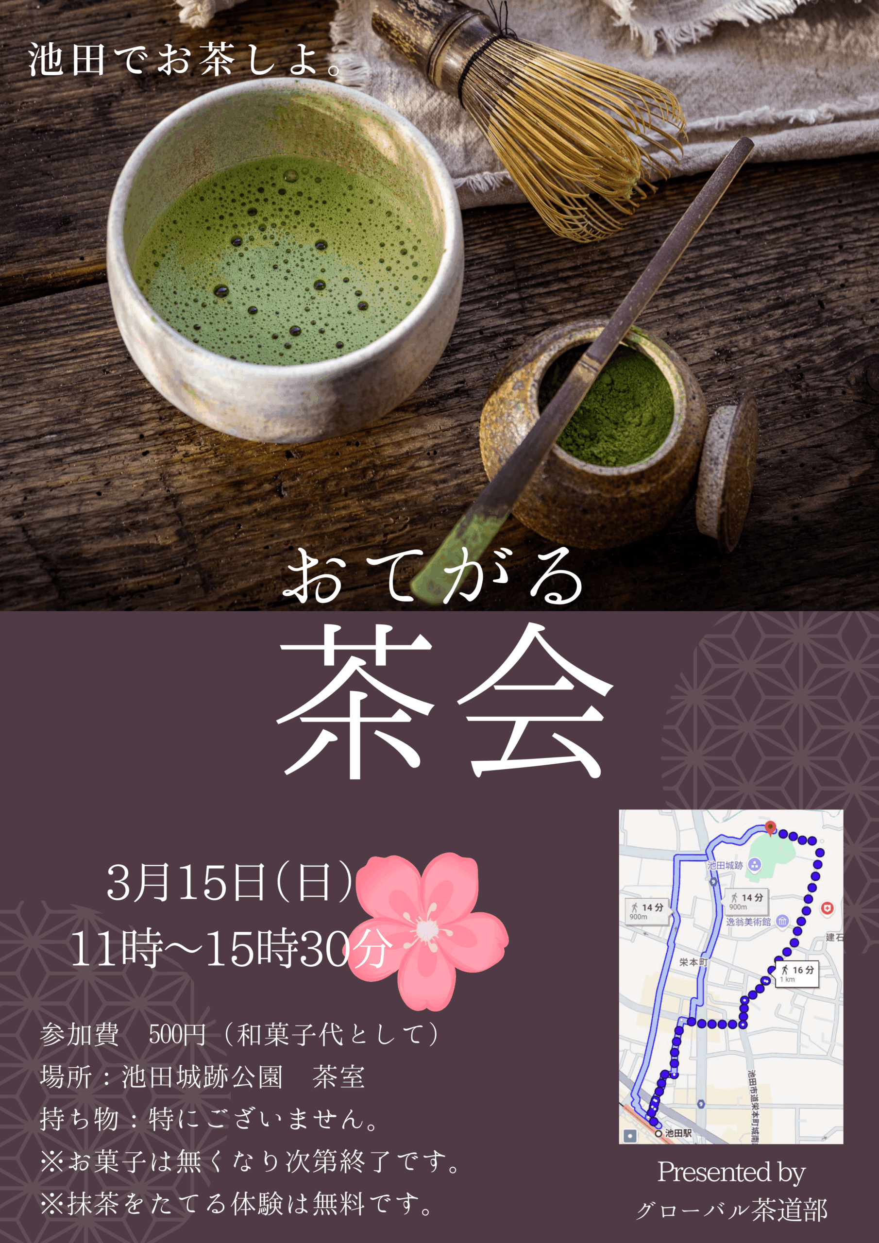 投稿日: 2026年2月22日2026年2月22日 投稿者: ikedashiroatoおてがる 茶会🍵 🍃3月15日(日)11時~15時30分 🍃池田城跡公園 茶室 🍃参加費 500円(和菓子代として) 🍃主催 グローバル茶道部 ※お菓子、お茶は無くなり次第終了いたします ※抹茶をたてる体験は無料です