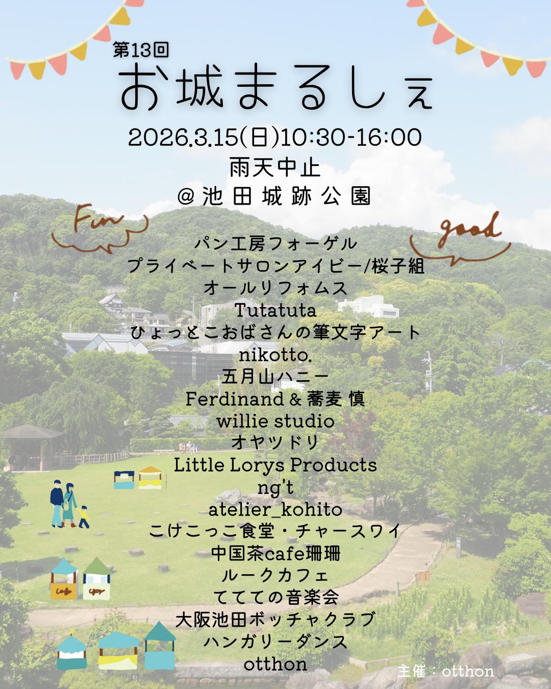 投稿日: 2026年2月8日2026年2月8日 投稿者: ikedashiroatoお城まるしぇ🎪 「お城まるしぇ」を開催いたします🎪 3月15日(日)10:30~16:00 ご来園お待ちしております😊 ⇩ ⇩ ⇩ ⇩