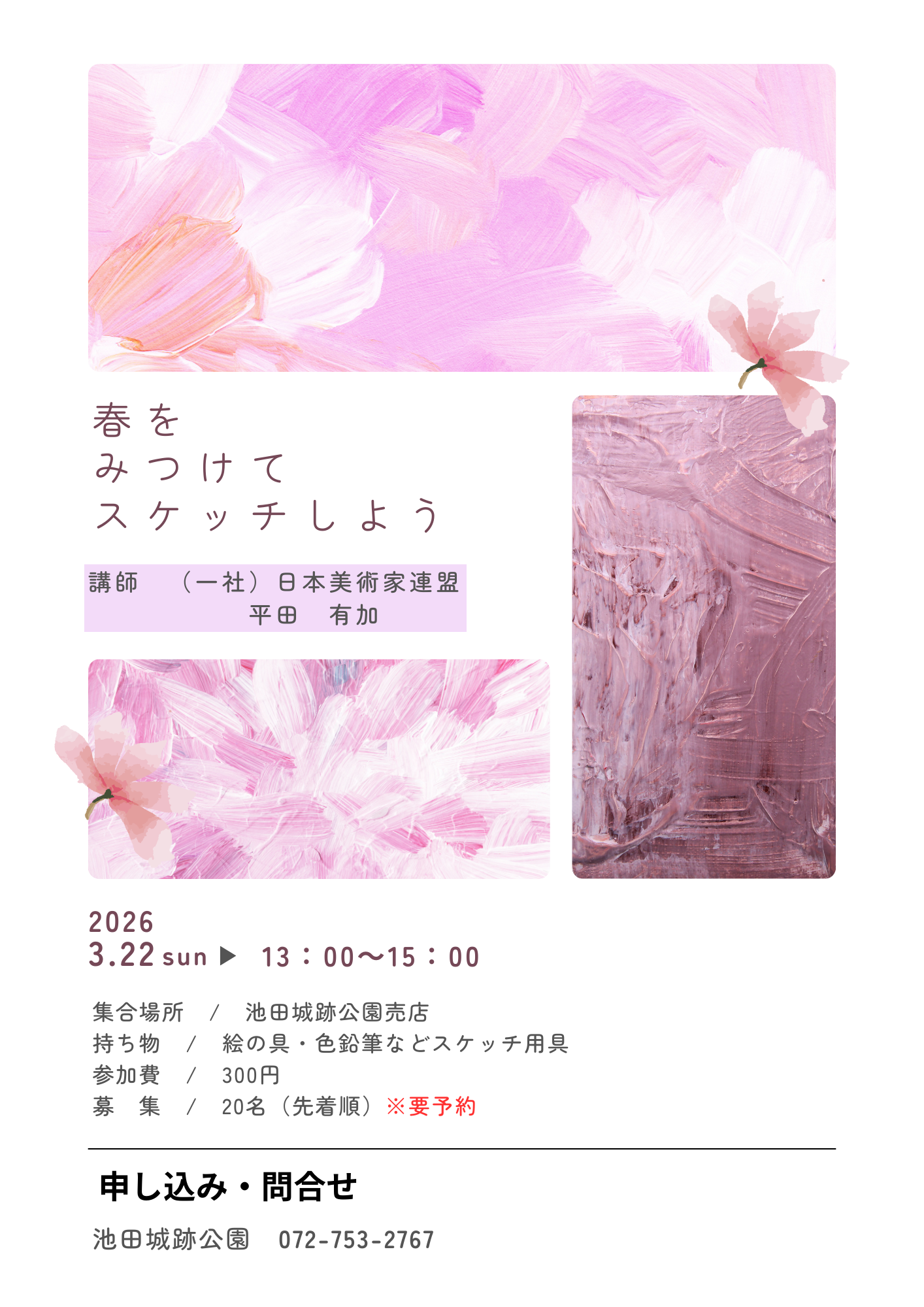 投稿日: 2026年2月15日2026年2月15日 投稿者: ikedashiroato春を見つけてスケッチしよう スケッチイベントを開催します🌸 3月22日(日)13時~15時 雨天中止☔ ご予約お待ちしております ↓ 詳細は下記の画像をご覧ください ↓