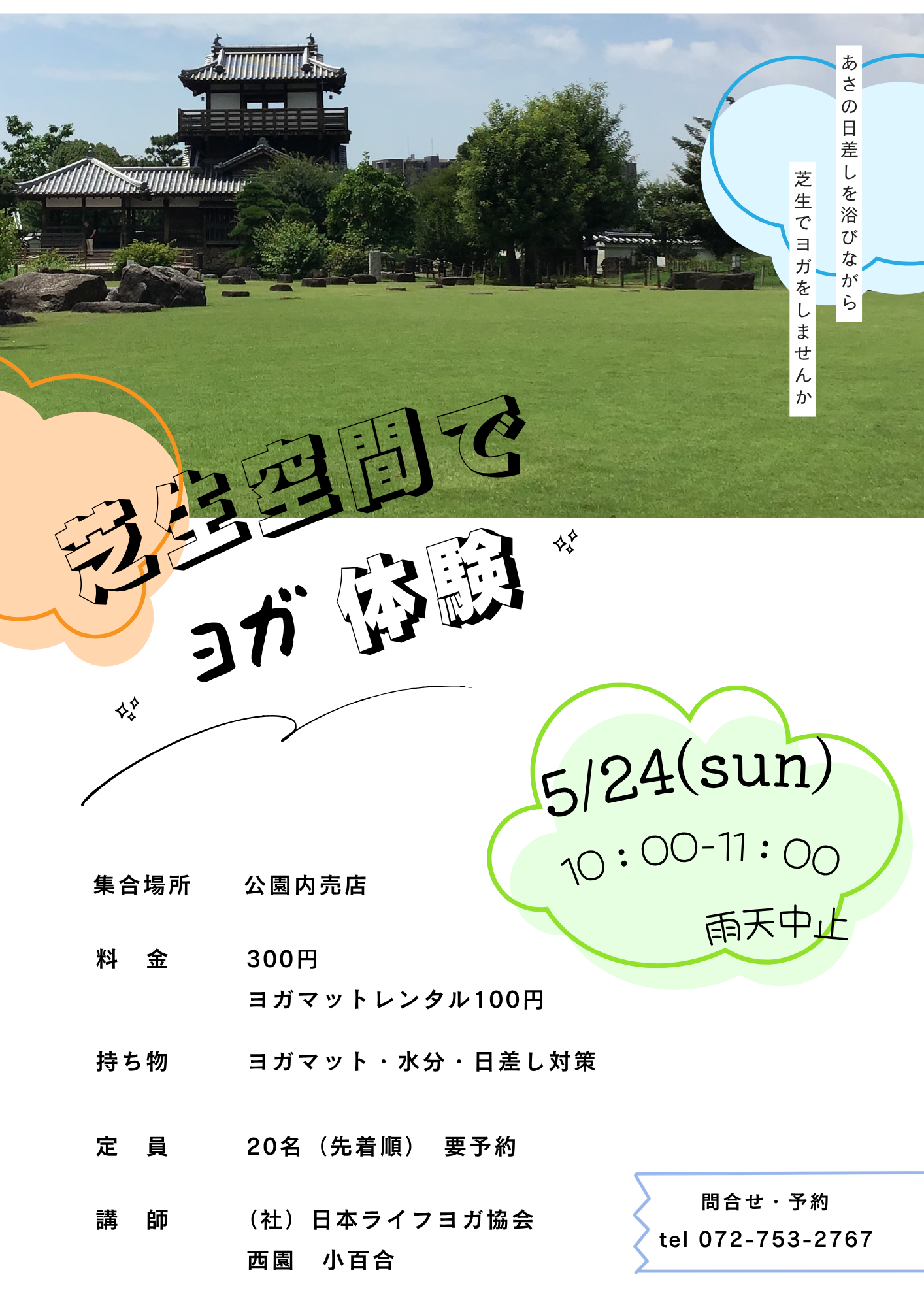 投稿日: 2026年4月24日2026年4月24日 投稿者: ikedashiroato芝生空間でヨガ体験 ☁5月24日(日) ☁10時~11時 雨天中止☔ ☁参加費300円 ヨガマットレンタル+100円 ☁定員20名 要予約! ご参加お待ちしております。